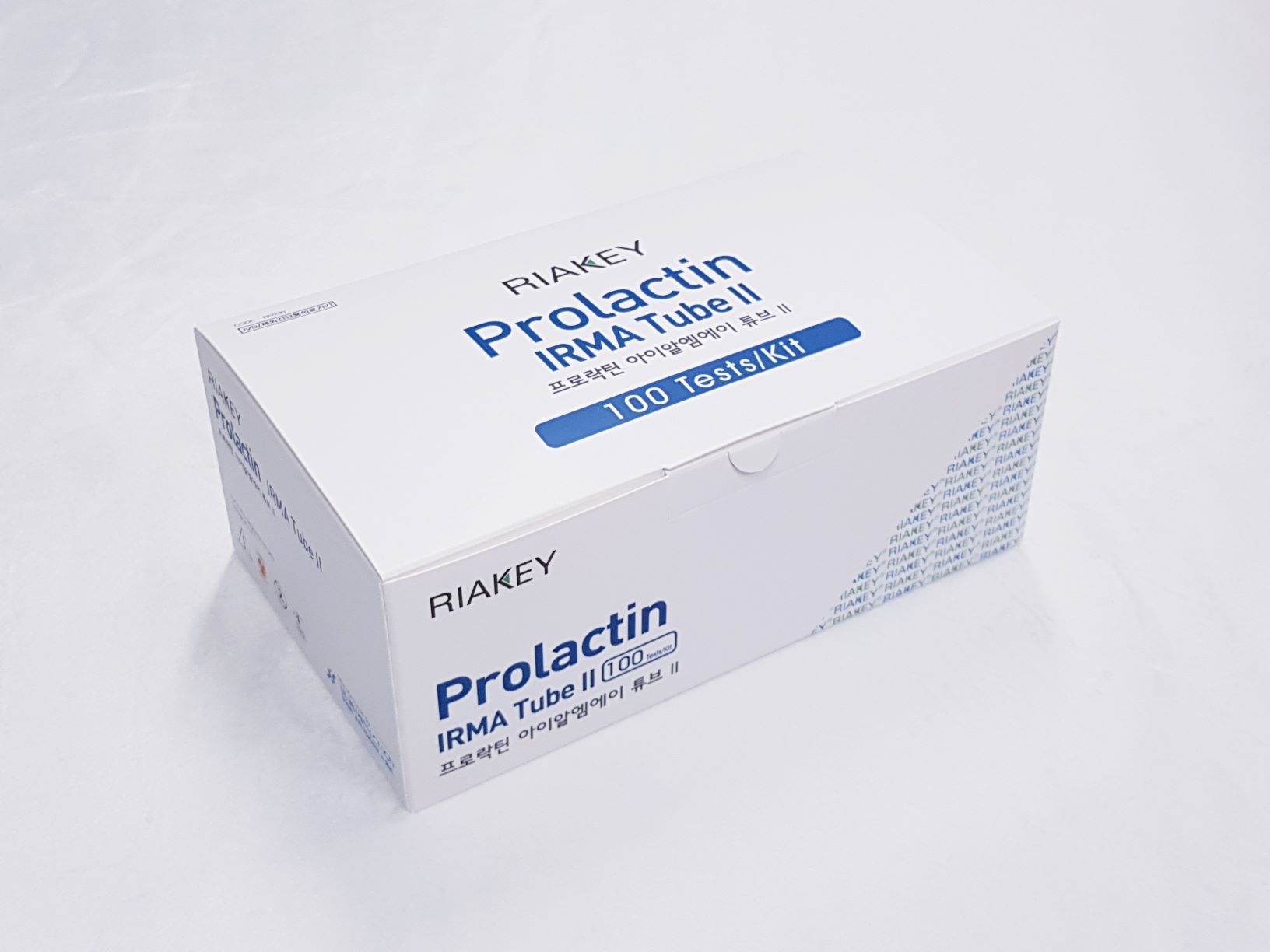 The RIAKEY Prolactin IRMA Tube II is an one step non-competitive immunoradiometric (IRMA) method (“sandwich”). The method employs two highly specific monoclonal anti-PRL antibodies which recognize two different epitopes of the molecule. One antibody is coated on solid phase (coated tube), the other, specific for the PRL and labeled with Iodine-125, is used as a tracer. Antibody-coated polystyrene tubes serve as solid phase. The tracer antibody and the coated antibody react simultaneously with the PRL antigen present in the standards, control serum and samples. Unbounded material is removed by a washing step. The amount of bound tracer will be directly proportional to the PRL antigen concentration and the remaining radioactivity bound to the tubes is measured in a gamma scintillation counter.